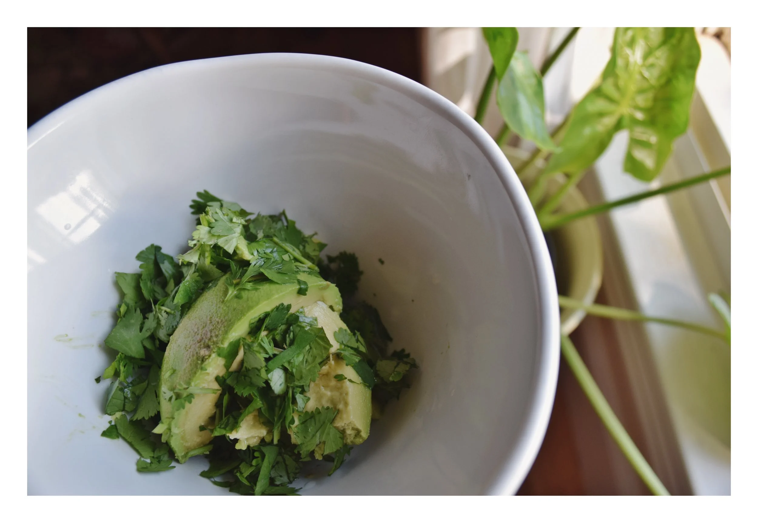 - While bread is toasting, add avocado, cilantro, and lime juice into a bowl.