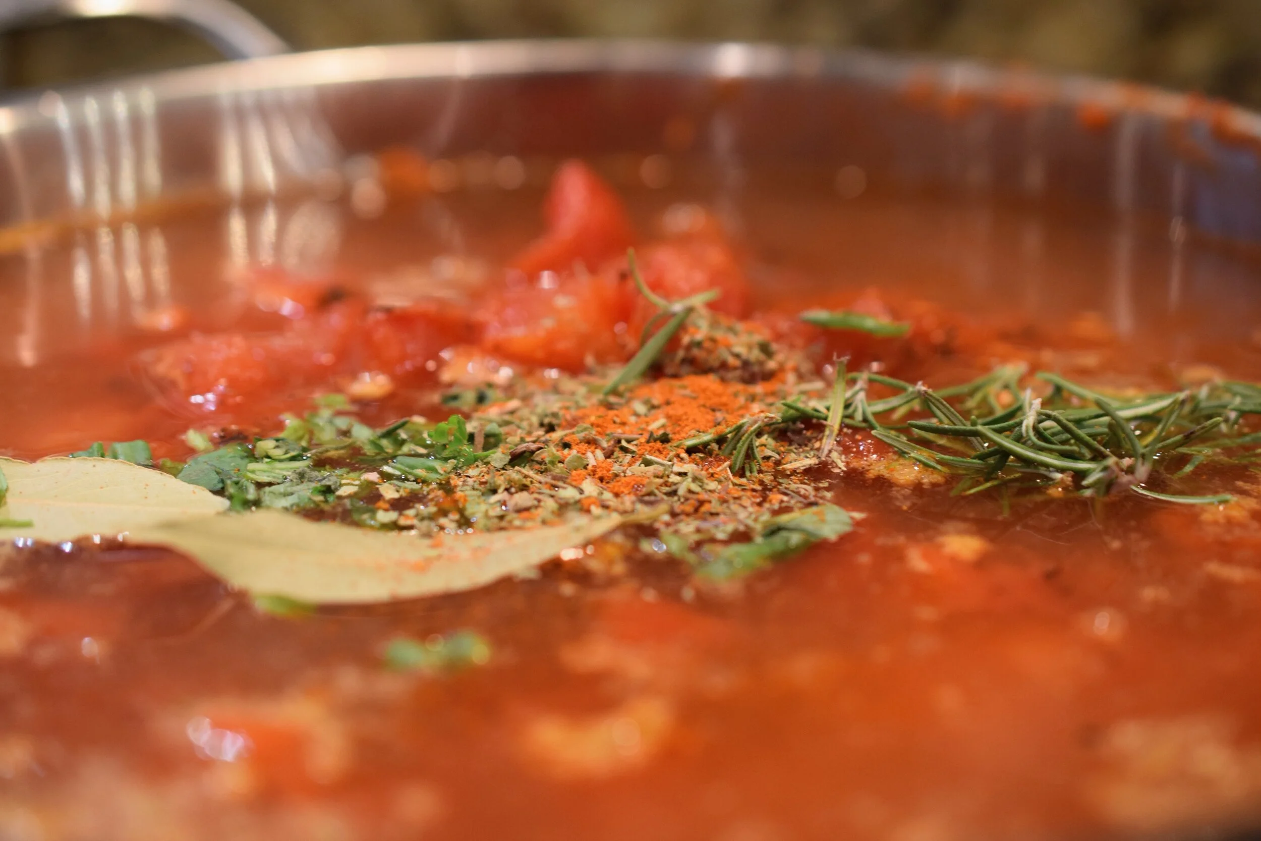 - Toss roasted tomatoes, chicken broth, bay leaves, rosemary, sweet paprika, and Herbes de Provence into the pot. Simmer without a top for 30 minutes.